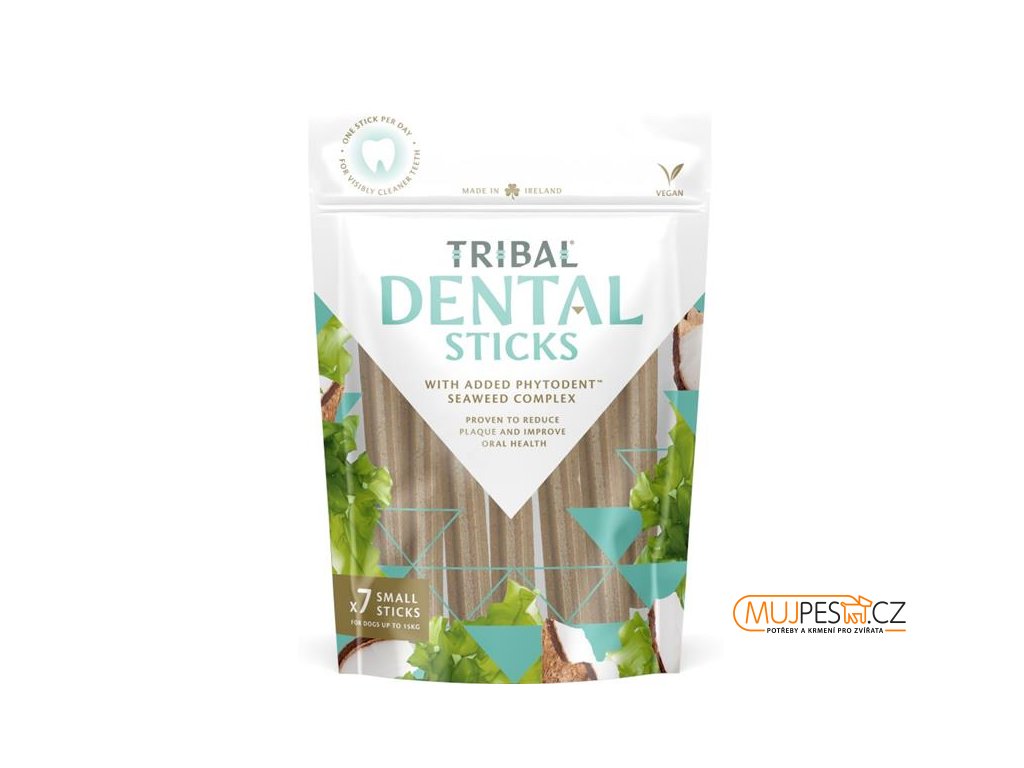 Tribal Dental Sticks Small jsou veganské tyčky s nízkým obsahem tuku vyrobené bez obilovin, přidaného cukru, umělých barviv a konzervačních látek. Jsou určené pro psy všech plemen do 15 kg a od 6 měsíců věku a jsou vhodné i pro psy s onemocněním štítné žlázy.
