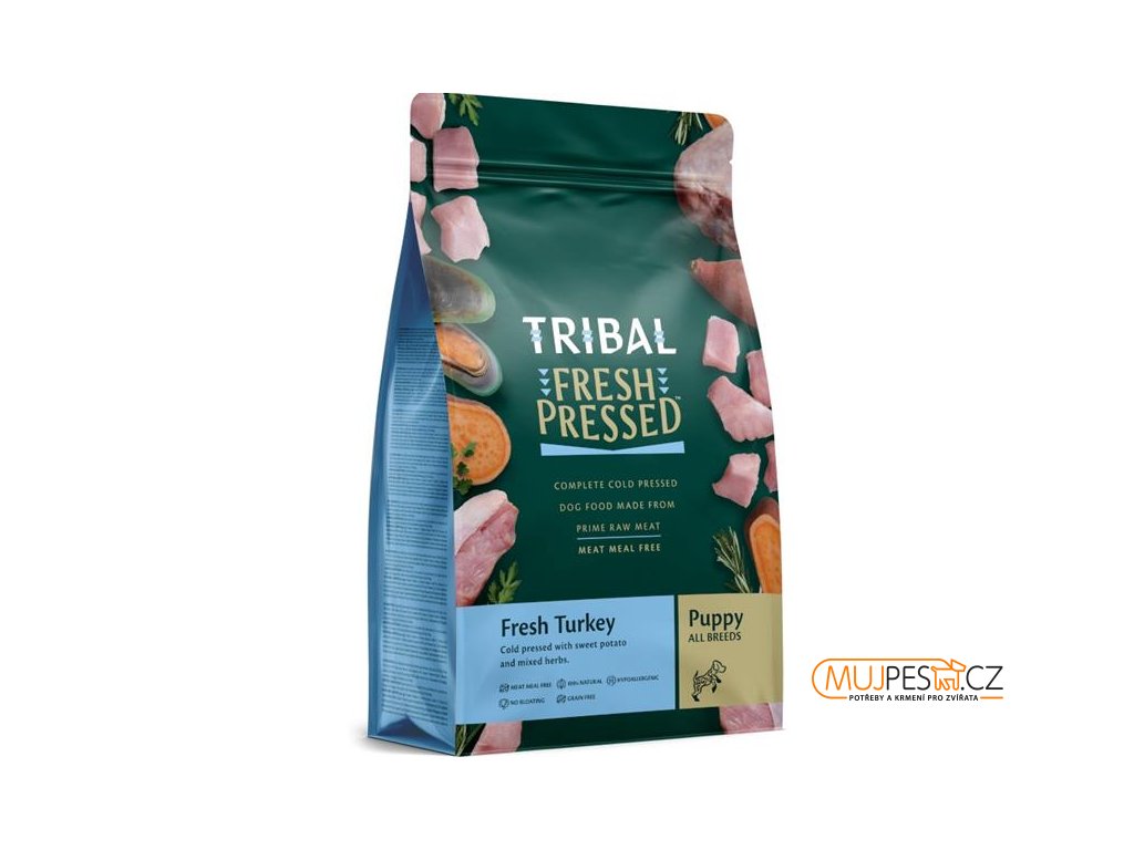 Receptura TRIBAL Fresh PressedTM Puppy Turkey obsahuje 55 % čerstvé krůty, ryb a vajec + batáty, směs bylin a mnoho dalších hodnotných ingrediencí. Určená je především pro štěňata.