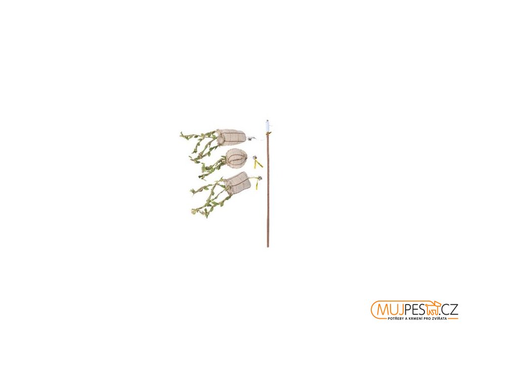 Vábnička s rukojetí ze dřeva má 3 výměnné závěsy s textilní hračkou, rolničkou a třásněmi z provázků ozdobených textilními lístečky. Hračka stimuluje lovecké instinkty a posiluje pouto mezi vámi a vaší kočkou při společné, interaktivní hře. Je vhodná pro kočky všech věkových kategorií.