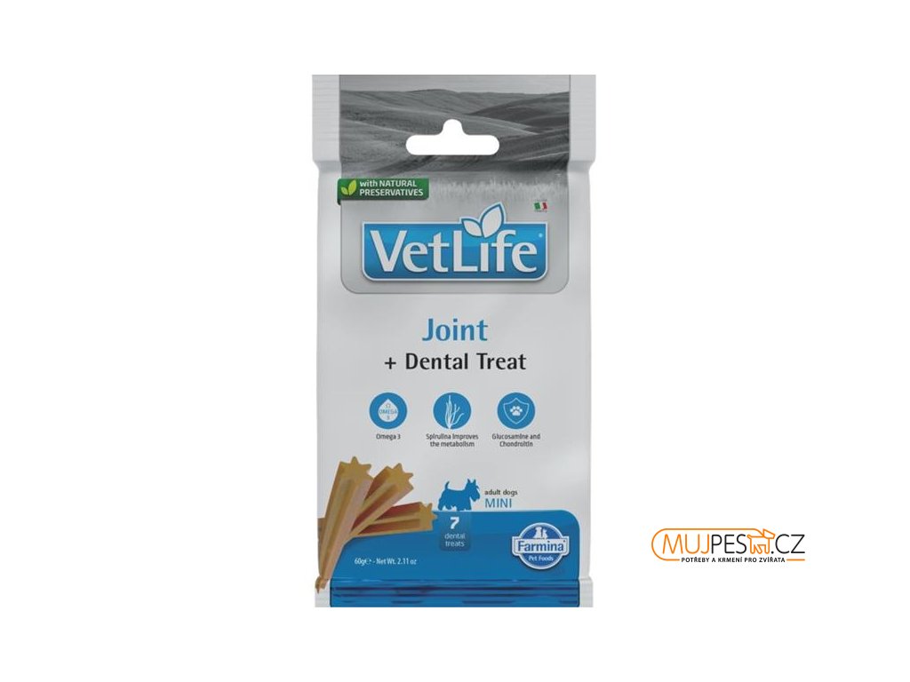 Pamlsky Vet Life Dental Treat jsou vyvinuty speciálně tak, aby si na nich váš pes pochutnal, vyčistil si jimi zuby, namasíroval dásně a přitom dodržel předepsanou klinickou dietu. Pamlsky Vet Life Joint Dental Treat obsahují omega-3 mastné kyseliny, chondroitin a glukosamin pro optimální zdraví kloubů. Jsou určené pro psy s veterinární dietou zaměřenou na podporu kloubního aparátu.