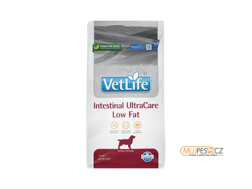 Farmina Vet Life Intestinal UltraCare Low Fat je kompletní dietetické krmivo pro dospělé psy určené pro podporu zažívání při střevních resorpčních onemocněních a pro kompenzaci maldigesce a exokrinní pankreatické nedostatečnosti.