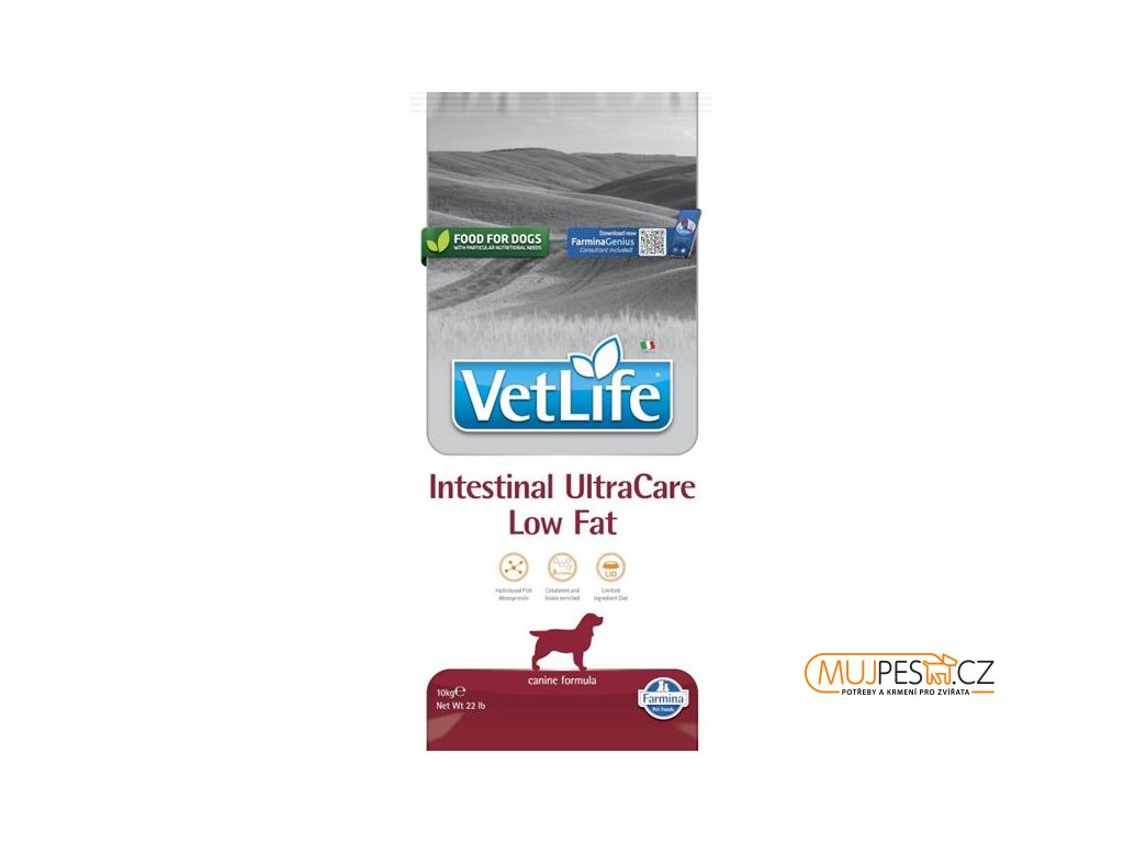 Farmina Vet Life Intestinal UltraCare Low Fat je kompletní dietetické krmivo pro dospělé psy určené pro podporu zažívání při střevních resorpčních onemocněních a pro kompenzaci maldigesce a exokrinní pankreatické nedostatečnosti.