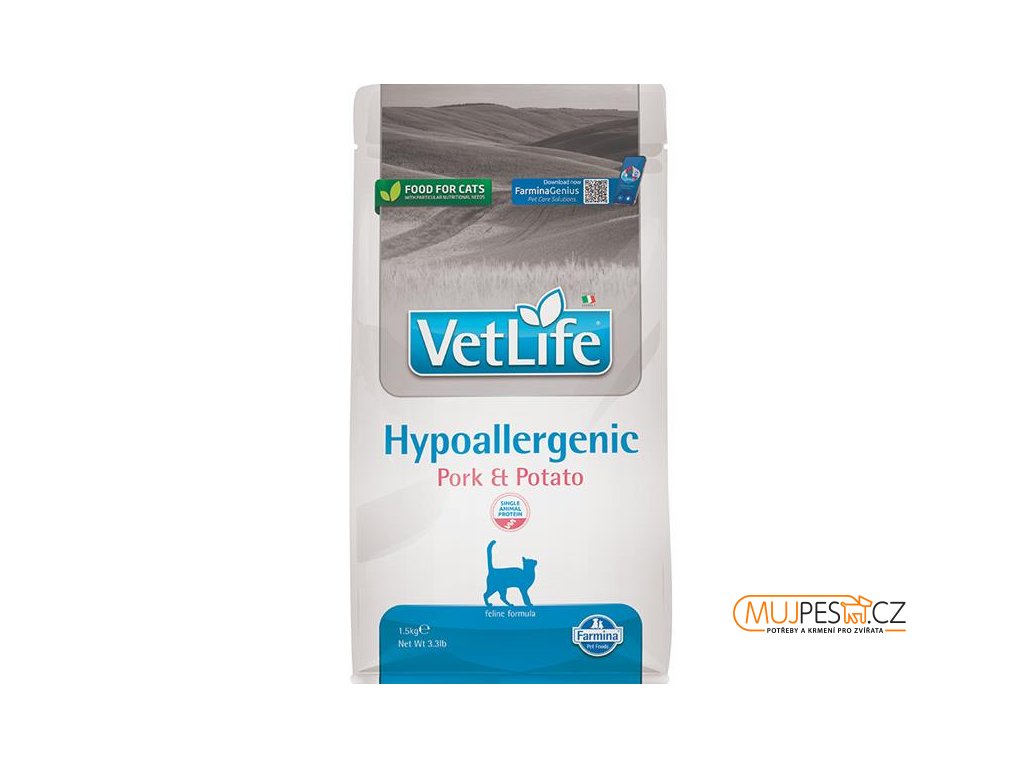 Farmina Vet Life Hypoallergenic Pork & Potato je kompletní suché dietetické krmivo pro dospělé kočky určené ke snížení výskytu potravinových alergií a nesnášenlivostí (intolerancí). Granule se používají také pro podporu správných funkcí kůže v případě kožních poruch a nadměrné ztráty srsti. Jediným zdrojem proteinů v krmivu je dehydratovaný vepřový protein a jediným zdrojem sacharidů batáty, čímž je eliminována nesnášenlivost vůči jiným složkám potravy.