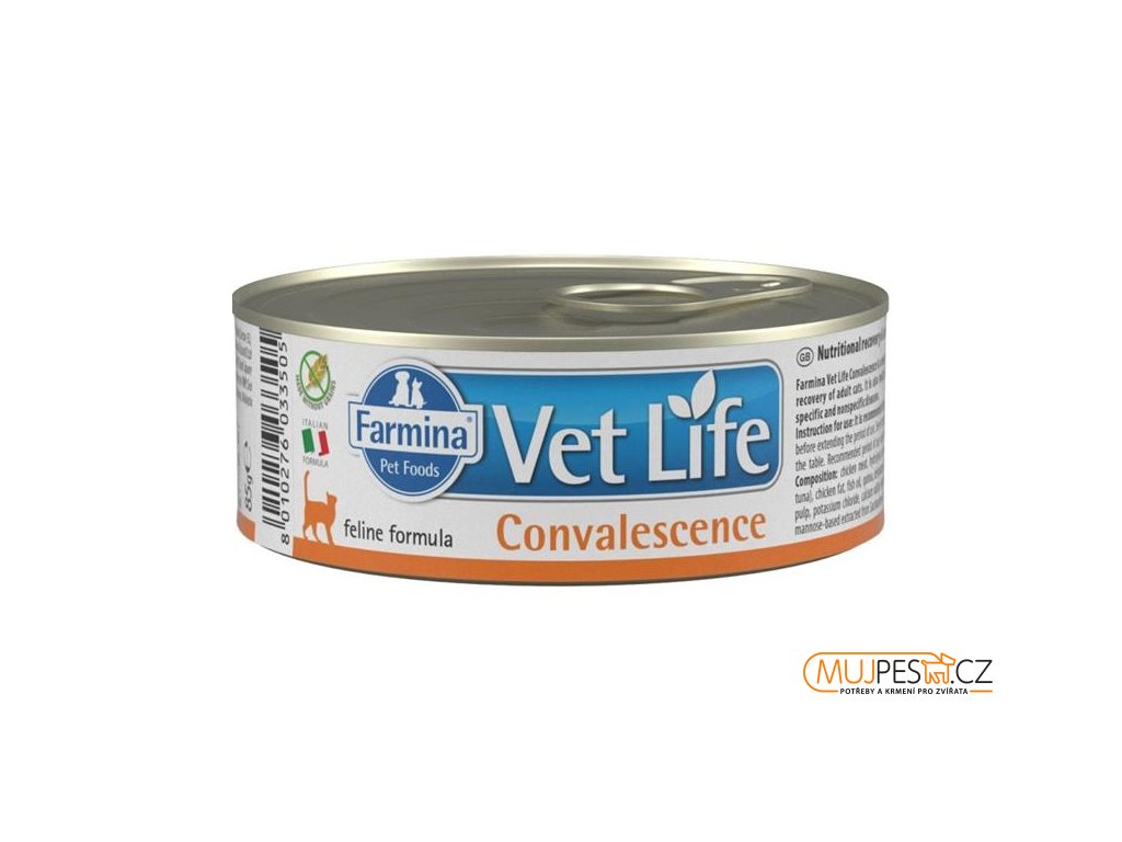 Farmina Vet Life Convalescence je kompletní dietetické krmivo pro zvláštní účely výživy pro dospělé kočky určené pro nutriční obnovu a regeneraci. Může být také indikováno jako nutriční podpora jedinců trpících specifickým či nespecifickým onemocněním.