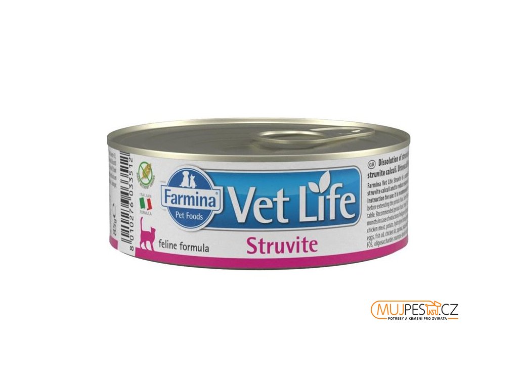 Farmina Vet Life Struvite je kompletní dietetické krmivo pro zvláštní účely výživy pro kočky určené pro podporu rozpouštění struvitových kamenů a k omezení jejich opakované tvorby.