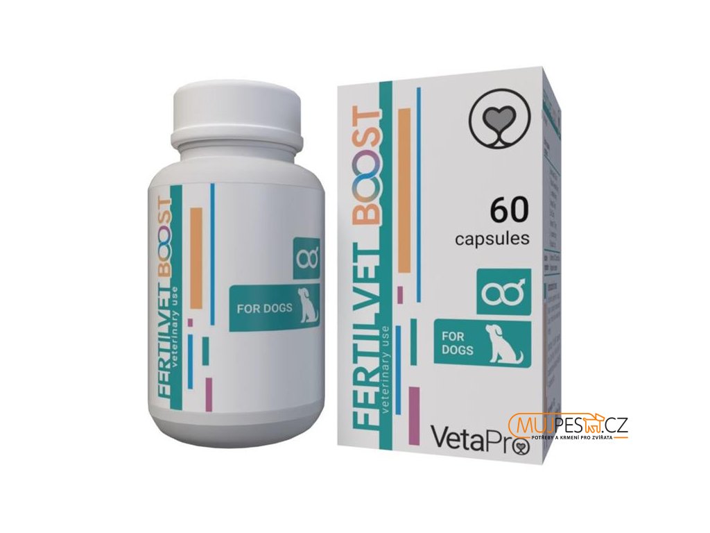 FertilVet Boost je nutriční doplněk určený dospělým psím samcům ke zvýšení počtu a pohyblivosti spermií a celkové plodnosti. Směs přírodních látek, které zvyšují libido a zlepšují plodnost (Tribulus terrestris, maca černá), zvyšují pohyblivost spermií (L-karnitin), kvalitu spermií a hladinu reprodukčních hormonů (omega-3 mastné kyseliny). Zinek je nezbytný pro vývoj spermií, kyselina listová pomáhá tvorbě DNA ve spermiích, selen a vitamín E snižují poškození volnými radikály a zlepšují pohyblivost spermií.