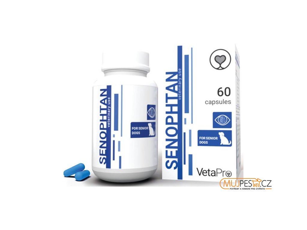 Senophtan je nutriční doplněk k zachování zraku a kognitivních funkcí, který pomáhá starším psům žít kvalitní život odpovídající jejich věku. Směs potravinových antioxidantů (vitamín E, vitamín C, lutein, betakaroten, zeaxantin, astaxanthin), mitochondriálního kofaktoru (kyselina alfa-lipoová) a omega-3 mastných kyselin (DHA) pro optimální zdraví mozku a kognitivní funkce.