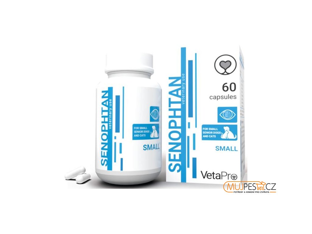 Senophtan Small je nutriční doplněk k podpoře zachování zraku a kognitivních funkcí, který pomáhá starším psům malých plemen a kočkám žít kvalitní život odpovídající jejich věku. Směs taurinu (aminosulfonová kyselina podporující činnost srdce, zdraví očí a funkci imunitního systému), potravinových antioxidantů (vitamín E, vitamín C, lutein, betakaroten, zeaxantin, astaxanthin), mitochondriálního kofaktoru (kyselina alfa-lipoová) a omega-3 mastných kyselin (DHA) pro optimální zdraví mozku a kognitivní funkce.