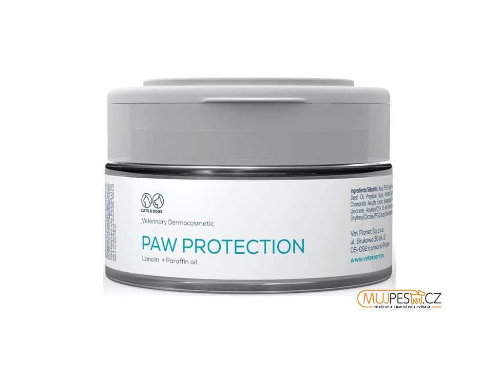 Složky obsažené v masti Paw Protection pečují o citlivé polštářky na tlapkách a chrání je díky kombinaci účinných složek: