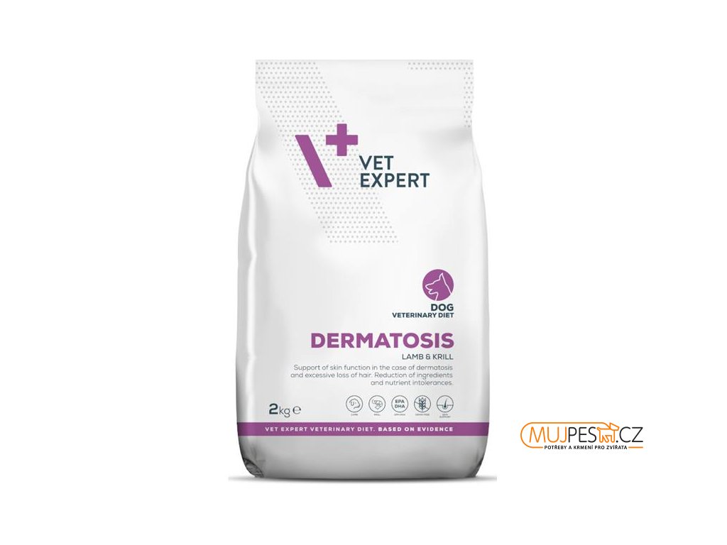 VetExpert VD 4T Dermatosis Dog Lamb & Krill je kompletní dietní krmivo pro dospělé psy, které podporuje zdraví kůže, pomáhá při dermatózách a nadměrném vypadávání srsti a přispívá k redukci projevů potravinových alergií.