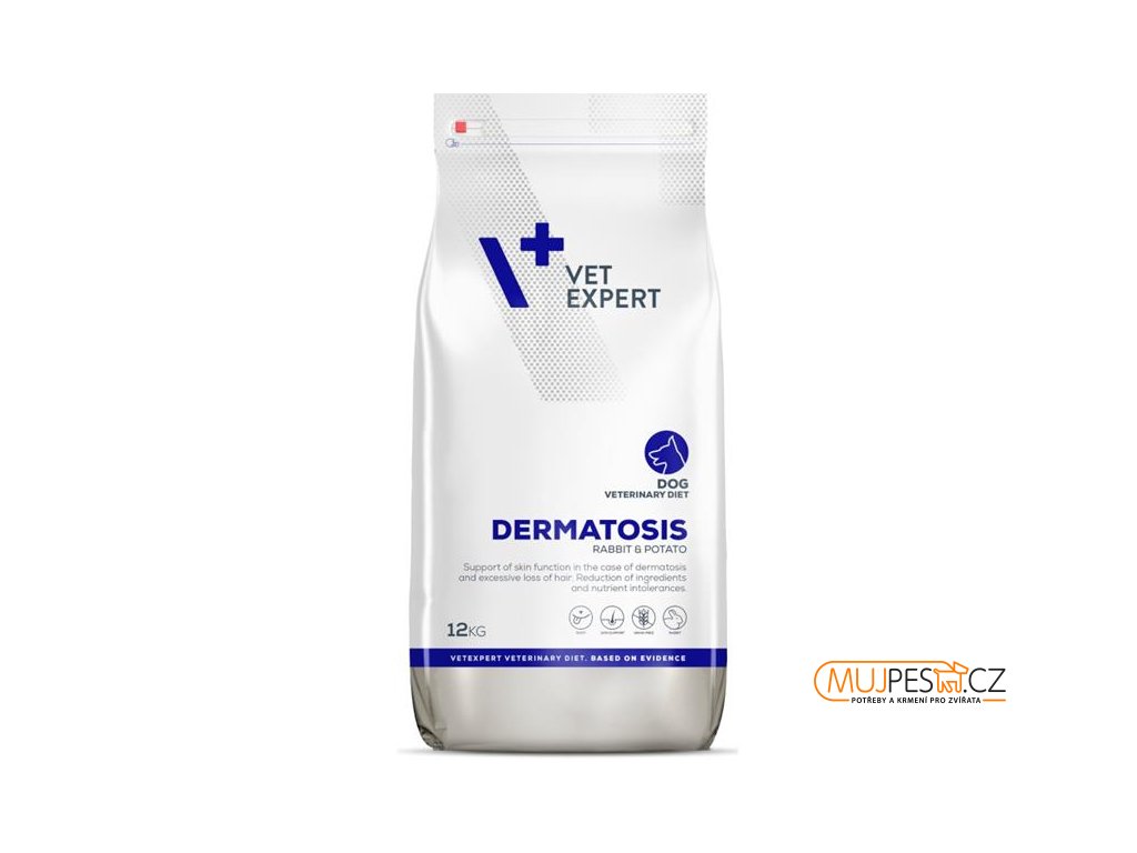 VetExpert VD 4T Dermatosis Dog Rabbit & Potato je kompletní dietní krmivo pro dospělé psy, které podporuje zdraví kůže, pomáhá při dermatózách a nadměrném vypadávání srsti a přispívá k redukci projevů potravinových alergií.