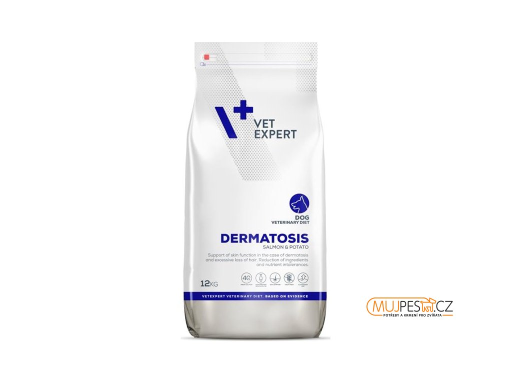 VetExpert VD 4T Dermatosis Dog Salmon & Potato je kompletní dietní krmivo pro dospělé psy, které podporuje zdraví kůže, pomáhá při dermatózách a nadměrném vypadávání srsti a přispívá k redukci projevů potravinových alergií.