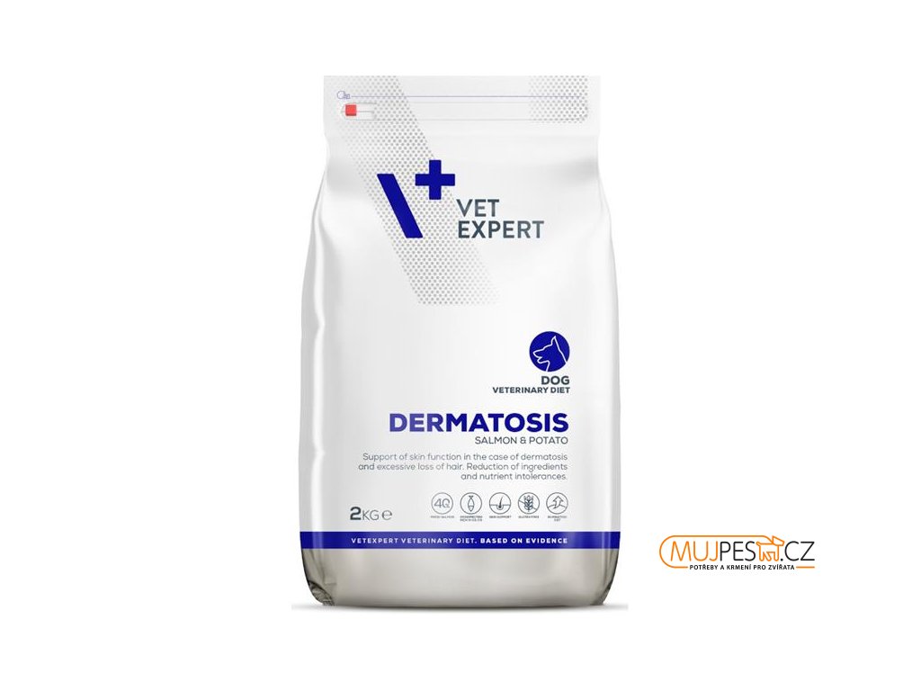 VetExpert VD 4T Dermatosis Dog Salmon & Potato je kompletní dietní krmivo pro dospělé psy, které podporuje zdraví kůže, pomáhá při dermatózách a nadměrném vypadávání srsti a přispívá k redukci projevů potravinových alergií.