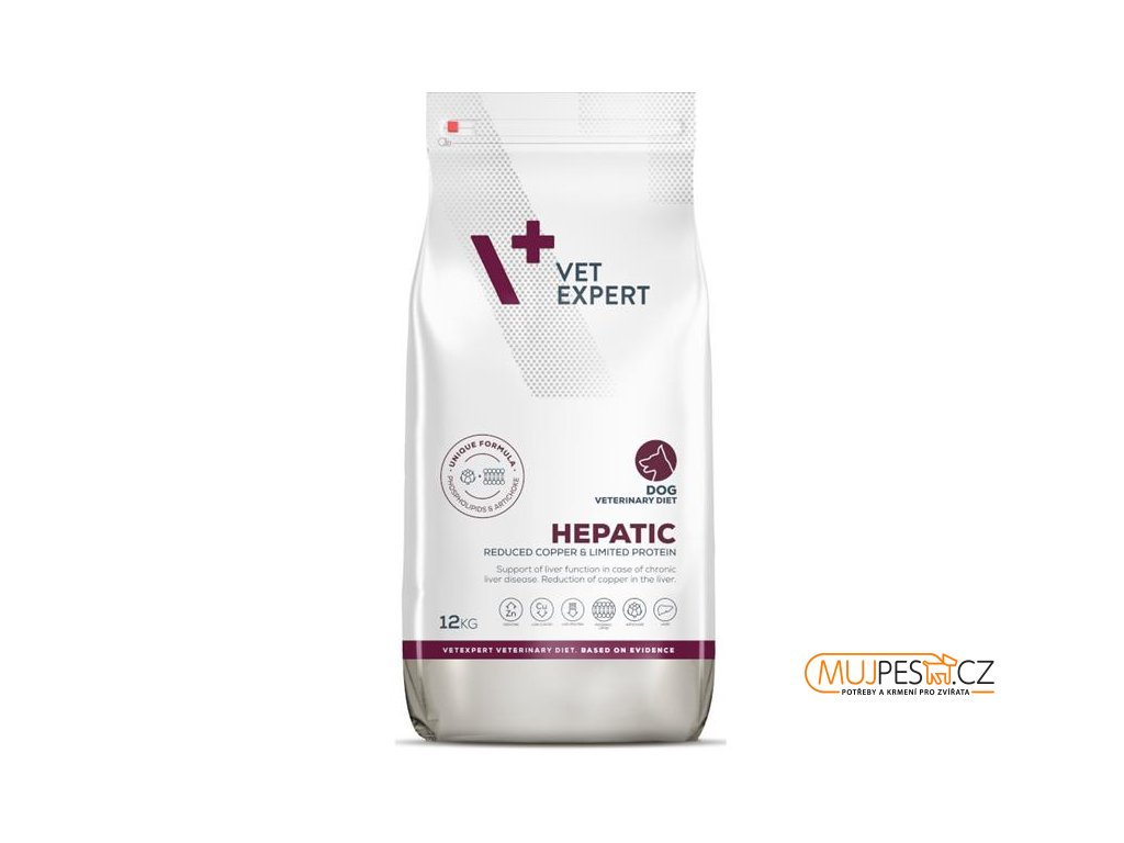 VetExpert VD 4T Hepatic Dog je kompletní dietní krmivo pro dospělé psy, které podporuje funkci jater při chronické jaterní insuficienci a snižuje hromadění mědi v játrech. Obsahuje vysoce kvalitní a snadno stravitelné bílkoviny, upravený obsah mědi a zvýšený obsah esenciálních mastných kyselin.