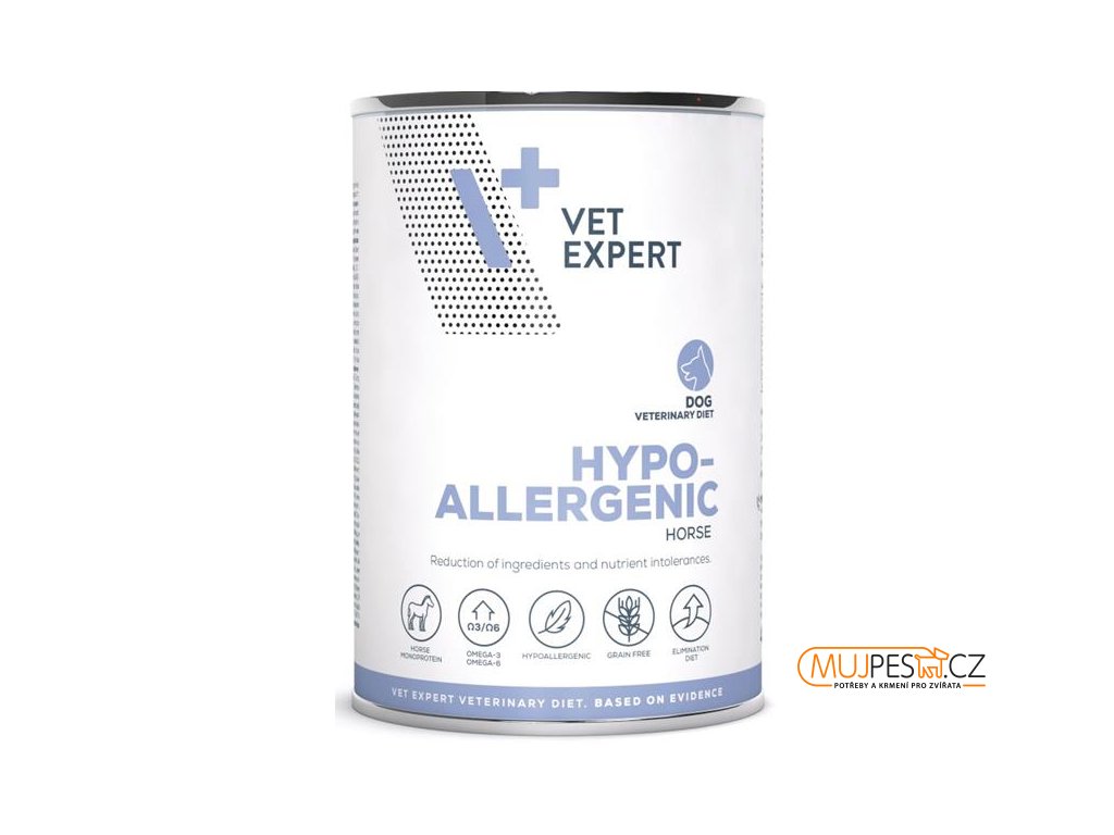 VetExpert Hypoallergenic Horse Mokré je kompletní dietní krmivo pro dospělé psy určené ke zmírnění potravinových nesnášenlivostí a k podpoře funkce kůže při dermatóze a nadměrné ztrátě srsti.