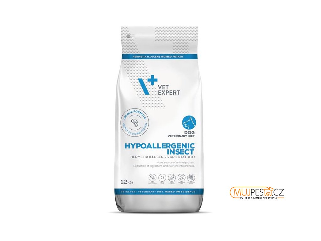 VetExpert Hypoallergenic Insect je kompletní dietní krmivo pro dospělé psy určené ke zmírnění potravinových nesnášenlivostí a k podpoře funkce kůže při dermatóze a nadměrné ztrátě srsti.