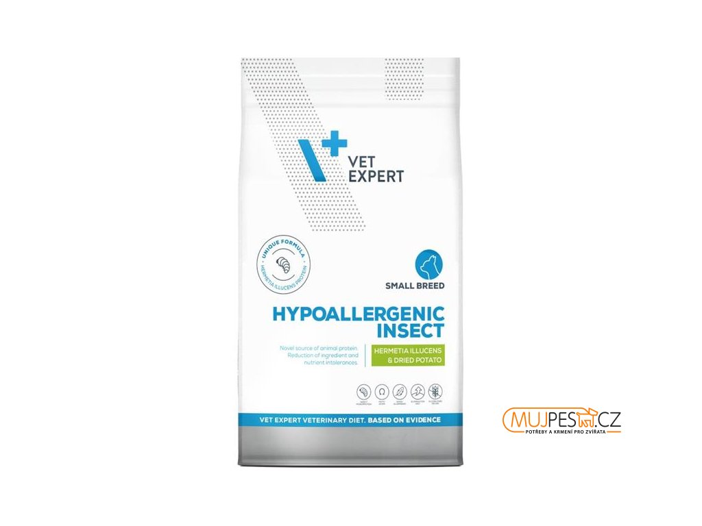 VetExpert Hypoallergenic Insect Small Breed je kompletní dietní krmivo pro dospělé psy malých plemen, určené ke zmírnění potravinových nesnášenlivostí a k podpoře funkce kůže při dermatóze a nadměrné ztrátě srsti.