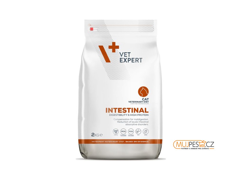 VetExpert VD 4T Intestinal Cat suché je kompletní dietní krmivo pro dospělé kočky, které trpí poruchami trávení, akutními střevními potížemi nebo chronickou pankreatickou nedostatečností. Obsahuje vysoce stravitelné složky, prebiotika, zvýšený obsah elektrolytů a antioxidant lutein pro celkové zklidnění trávicího traktu.