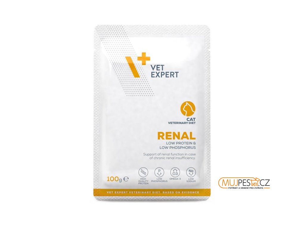 VetExpert VD 4T Renal Cat mokré je dietní krmivo pro dospělé kočky určené k podpoře funkce ledvin při chronické renální nedostatečnosti. Obsahuje omezené množství vysoce kvalitních bílkovin, vysoký obsah tuku pro zvýšený energetický příjem, snížený obsah fosforu a omega-3 mastné kyseliny pro ochranu ledvin a podporu metabolismu.