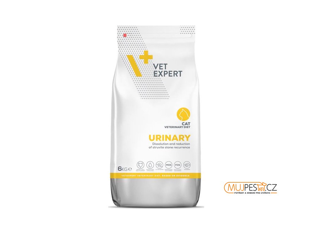 VetExpert VD 4T Urinary Struvite Cat suché je kompletní dietní krmivo pro dospělé kočky určené k rozpuštění struvitových kamenů a prevenci jejich opětovné tvorby. Obsahuje zvýšený obsah sodíku a chloridů pro podporu příjmu vody, DL-methionin k okyselení moči a látky podporující zdraví močových cest.