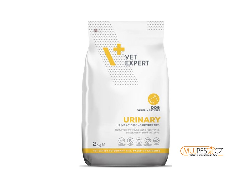 VetExpert VD 4T Urinary Struvite Dog suché je kompletní dietní krmivo pro dospělé psy, určené ke snížení a rozpuštění struvitových kamenů. Díky svému specifickému složení s nízkým obsahem fosforu, hořčíku a bílkovin, doplněné o brusinky a okyselující látky, efektivně přispívá k podpoře zdraví močových cest.