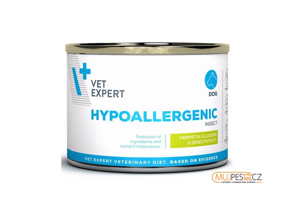VetExpert Hypoallergenic Insect Mokré je kompletní dietní krmivo pro dospělé psy určené ke zmírnění potravinových nesnášenlivostí a k podpoře funkce kůže při dermatóze a nadměrné ztrátě srsti.