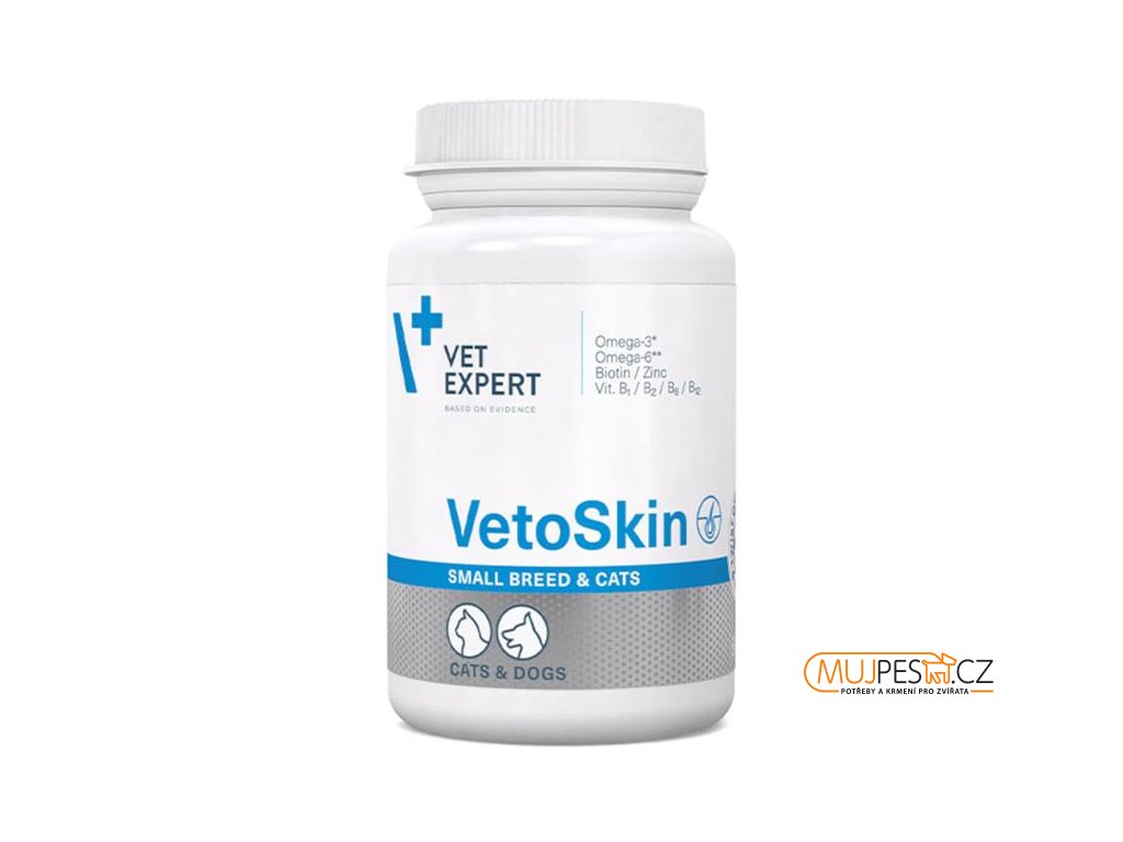 Doplněk stravy pro kočky a psy malých plemen podporující udržení optimálního stavu kůže a kvality srsti. Přípravek VetoSkin Small Breed and Cats je vhodný pro zvířata se suchou kůží, matnou srstí a s nadměrným vypadáváním srsti.