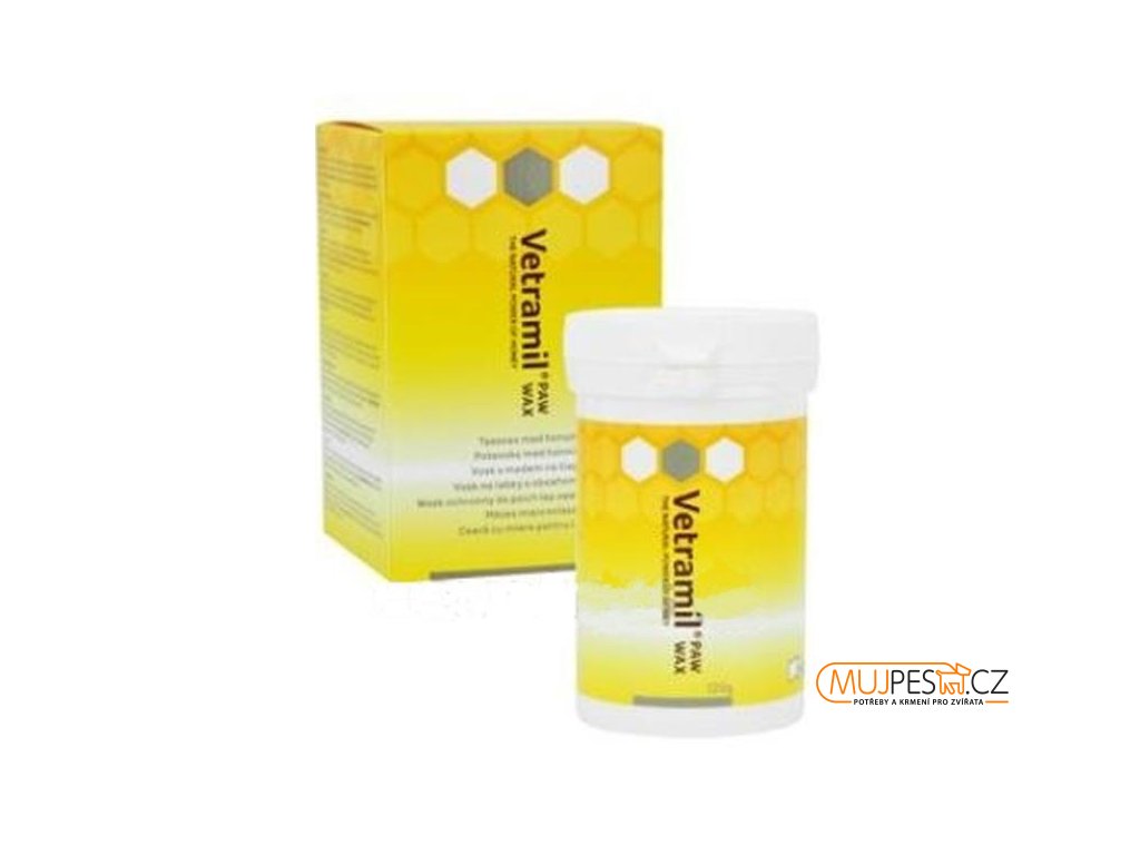 Vetramil® PAW WAX, vosk s medem na tlapky, byl vyvinut speciálně pro ochranu polštářků na tlapkách psů. Venku za účelem prevence poškození polštářků tlapek za extrémních podmínek. Doma za účelem prevence klouzání, protože tento výrobek polštářky na tlapkách mírně zdrsňuje. Vysoká koncentrace medu bohatého na enzymy ve výrobku napomáhá rychlému vyhojení prasklin. Včelí vosk vytváří ochrannou vrstvičku, díky níž zůstávají polštářky tlapek za všech okolností v dobré kondici. Hořká chuť zabraňuje tomu, aby si pejskové vosk olízali.