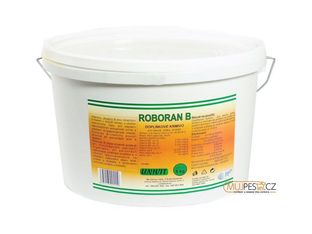Roboran B pro savce, ptáky a drůbež je vodorozpustný komplex vitaminů skupiny B, které jsou důležitým činitelem v období stresu, v období intenzivního růstu, pro zlepšení reprodukčních schopností zvířat a zlepšení životaschopnosti mláďat.