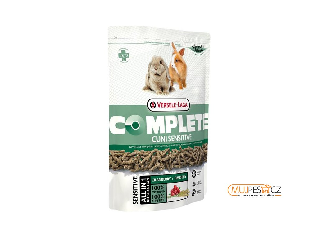 Kompletní krmivo pro zakrslé králíky. Cuni Sensitive Complete je 100% extrudované jednosložkové krmivo se sníženým obsahem energie, určené pro citlivé, méně aktivní nebo starší králíky. Je obohaceno o prebiotika, antioxidanty a brusinky. Usnadňuje tak trávení a podporuje správnou funkci močového ústrojí. Obsahuje vlákninu z celých neporušených kousků bojínkového sena. Bohatě doplněno o různé druhy trav a bylin. Neobsahuje obiloviny.