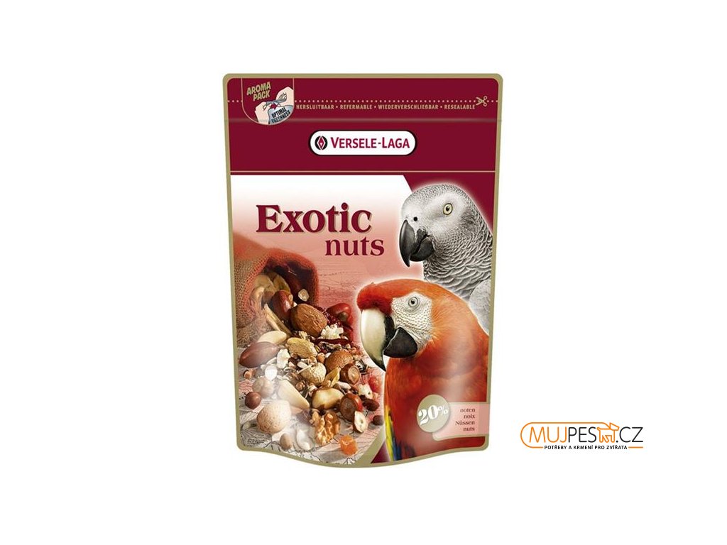 VL Prestige Exotic Nut Mix 750 g je doplňkové kmivo pro papoušky plné ořechů (mandle, vlašské a pekanové ořechy), zrnin a semen a ovoce.