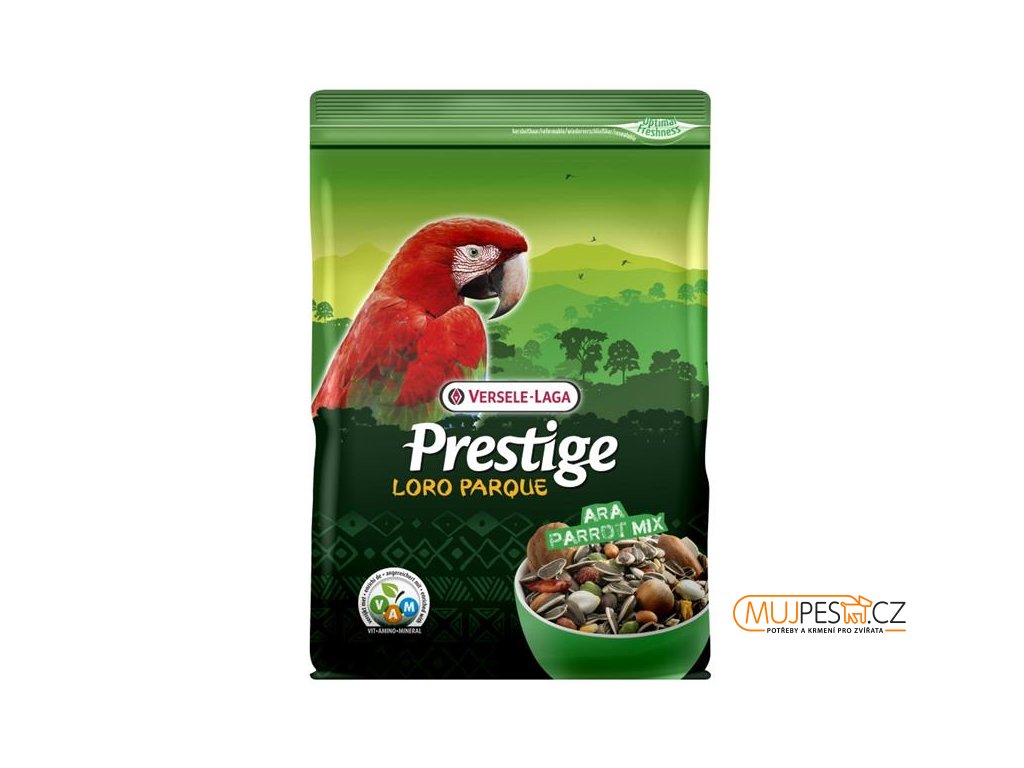 Směs zrnin Prestige Loro Parque je složena z pečlivě vybraných semen a je obohacena vitaminy, aminokyselinami a minerály ve formě chutných extrudovaných pelet V.A.M. Tyto pelety obsahují navíc složku Florastimil®, která zajišťuje optimální funkci střev a lepší kondici. Pro správnou funkci ptačího žaludku (gizzard) a správný poměr vápníků a fosforu v těle jsou do směsi přidány ještě čištěné ústřičné lastury.