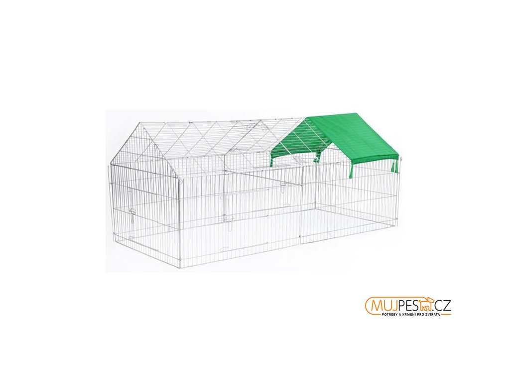 Prostorná klec pro chov králíků, větších hlodavců, kuřat a dalších drobných zvířat je tvořena čtyřmi drátěnými dílci, které se propojují a ukotvují k zemi dlouhými železnými kolíky. Ohrádka zvířatům brání v úniku a zároveň je chrání před útoky dravců. Přístup do výběhu umožňují troje boční dvířka. Součástí balení je plachta pro zakrytí cca čtvrtiny klece.