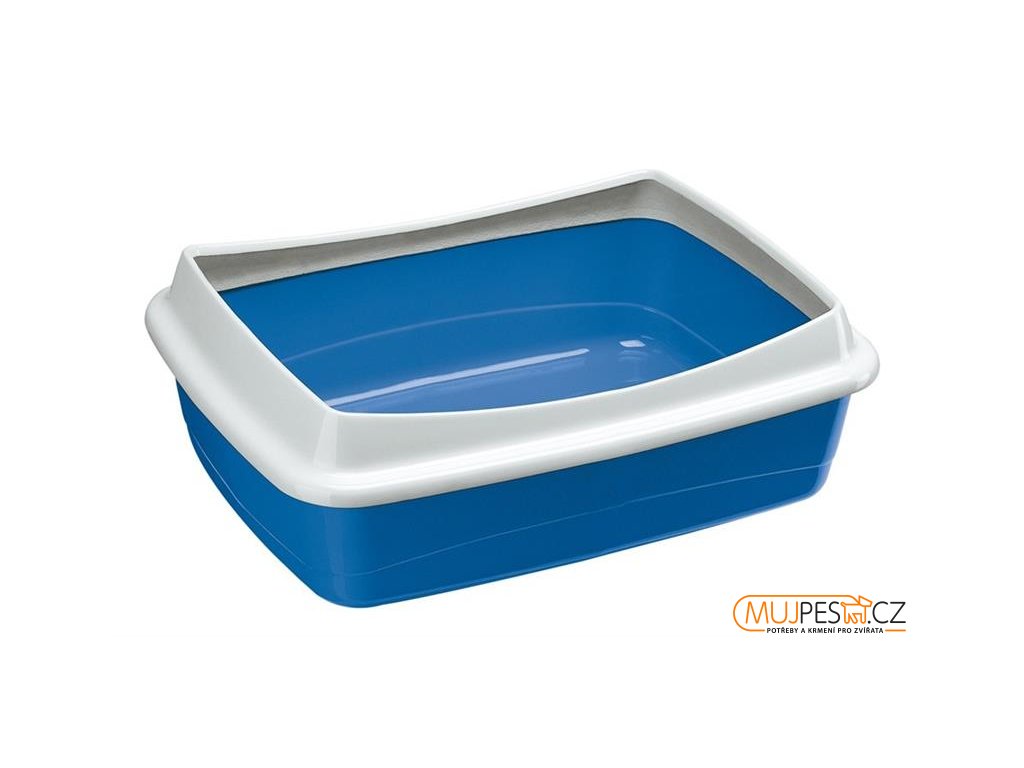 Plastová otevřená toaleta pro kočky se zvýšeným okrajem.