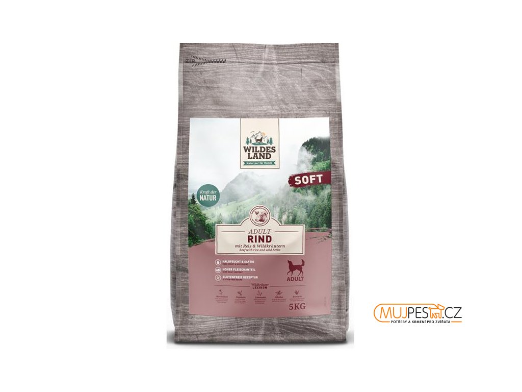 Polovlhké granule Wildes Land Soft jsou vhodné pro dospělé psy všech plemen, kterým poskytují v souladu s nejnovějšími vědeckými poznatky všechny důležité živiny a vitamíny, potřebné pro dlouhý a aktivní život. Mají vysoký obsah hovězího masa, které je zároveň jediným zdrojem živočišných bílkovin. Jako zdroje sacharidů slouží lehce stravitelná bezlepková rýže a brambory. Jde tudíž o ideální krmivo pro psy s citlivým zažíváním. Vysoký podíl čerstvého masa, zbytková vlhkost (18 %) a bylinky zvyšují chutnost krmiva.