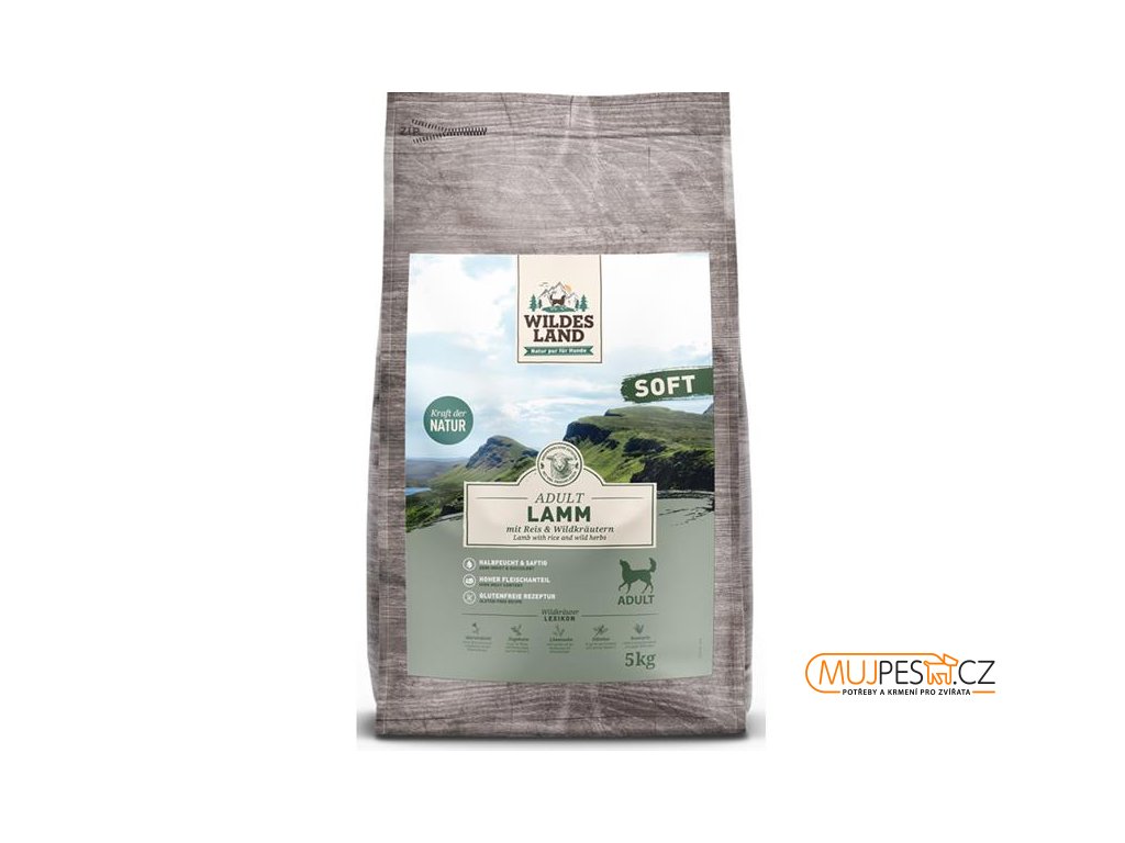 Polovlhké granule Wildes Land Soft jsou vhodné pro dospělé psy všech plemen, kterým poskytují v souladu s nejnovějšími vědeckými poznatky všechny důležité živiny a vitamíny, potřebné pro dlouhý a aktivní život. Mají vysoký obsah hypoalergenního jehněčího masa, které je zároveň jediným zdrojem živočišných bílkovin. Jako zdroje sacharidů slouží lehce stravitelná bezlepková rýže a brambory. Jde tudíž o ideální krmivo pro psy s citlivým zažíváním. Vysoký podíl čerstvého masa, zbytková vlhkost (18 %) a bylinky zvyšují chutnost krmiva.
