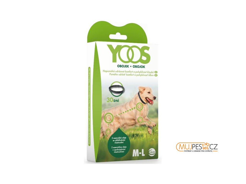 Obojek YOOS je určený pro psy středně velkých a velkých plemen s obvodem krku do 62,5 cm a hmotností do 50 kg. Nastavitelný obojek s blahodárným účinkem na klouby je napuštěný jedinečnou směsí esenciálních olejů, které byly vybrány pro své zklidňující vlastnosti. Pomáhá udržovat komfort a pohyblivost kloubů při vstávání, skákání, lezení a běhu. Účinkuje až 4 týdny.