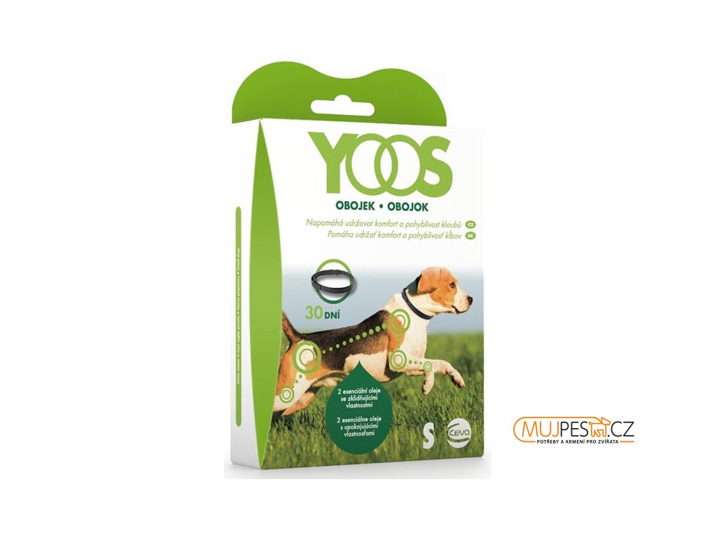 Obojek YOOS je určený pro psy malých plemen s obvodem krku do 46,5 cm a hmotností do 10 kg. Nastavitelný obojek s blahodárným účinkem na klouby je napuštěný jedinečnou směsí esenciálních olejů, které byly vybrány pro své zklidňující vlastnosti. Pomáhá udržovat komfort a pohyblivost kloubů při vstávání, skákání, lezení a běhu. Účinkuje až 4 týdny.