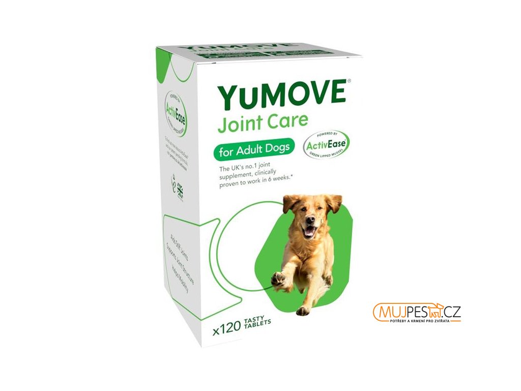 YuMOVE Joint Care je přírodní kloubní výživa ve formě žvýkacích tablet určená pro psy, kteří začínají vykazovat známky ztuhlosti kloubů. Tento prémiový doplněk stravy uvolňuje ztuhlé klouby, podporuje dlouhodobě jejich zdraví a zlepšuje pohyblivost díky speciálnímu složení s formulí ActivEase® ze slávky zelenoústé.