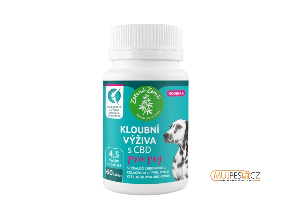 Tablety, které obsahují kanabidiol (CBD), jsou určené k podpoře zdraví kloubů u psů. CBD je jedním z kanabinoidů, který má terapeutické účinky a není psychoaktivní. Kromě CBD obsahuje kloubní výživa extrakt ze žraločí chrupavky, novoze´landske´ zelene´ musˇle, hyalurona´t sodny´, kolagen II. typu, methylsulfonylmethan a extrakt z kurkumovni´ku. Díky vysoce účinné kombinace látek lze tablety použít jako součást léčby pohybového aparátu (artróza) i v rámci prevence u sportovních a pracovních psů.