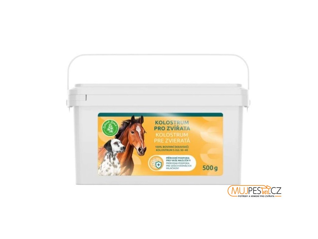 Kolostrum Zelená země posiluje imunitu, zlepšuje trávení a podporuje regeneraci u psů, koček, drobných savců, koní, skotu, koz, ovcí a prasat všech plemen a věkových kategorií. Kolostrum, označované též jako mlezivo, je takzvané prvotní mléko u savců. Tvoří se v mléčné žláze těsně před porodem a je produkováno asi 3–5 dní po něm. Složením se kolostrum významně liší od zralého mléka. Rozdíly ve složení mleziva se postupně mění a z nezralého mléka se stává mléko zralé. Je nenahraditelným zdrojem imunoglobulinů, bílkovin, vitamínů a minerálů. Kolostrum je vhodné pro zvířata jako náhrada mateřského mléka pro novorozená mláďata, při rekonvalescenci po nemoci nebo veterinárním zákroku nebo při oslabení imunity, dále jako podpora v období stresu a fyzické zátěže či pomoc při zánětech a bakteriálních infekcích.
