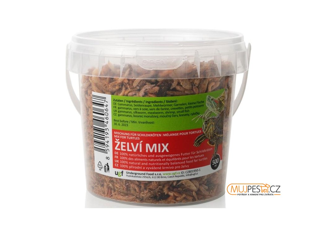Želví mix je čistě přírodní krmivo pro vodní a suchozemské želvy, které obsahuje mix vodních živočichů a sušený hmyz pro pestrost a vyváženost potravy. Obsahuje vysoké množství proteinů, vitamínů a minerálních látek, jako je například vápník, pro přirozený růst krunýře a kostí.