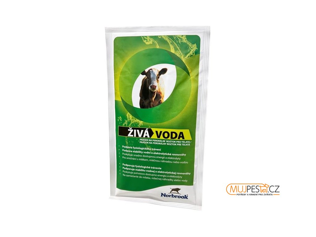 Podávání: 2 litry čerstvě připraveného roztoku Živé vody Norbrook podávejte 2x denně po 2 dny navíc k běžné mléčné výživě. Nepodávejte roztok a mléko současně. Pokud jsou příznaky závažné, muže být roztok podáván 3x nebo 4x denně. Roztok muže být samostatně podáván maximálně 4 dny. Živá voda Norbrook se nejlépe rozpustí při pomalém přidávání obsahu 1 sáčku do 2 litrů mléka, mléčné náhrady nebo vody za současného mírného míchání. Po rozpuštění obsahu sáčku se mohou objevit jemné usazeniny nerozpustných nosných částí, toto neovlivňuje účinnost přípravku.
